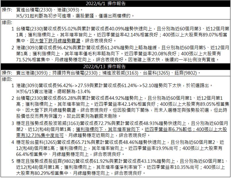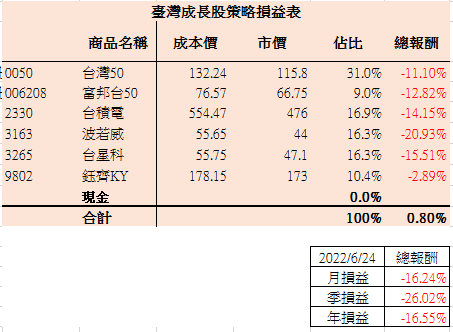 策略自發展以來損益 +0.8%。MTD -16.24%,YTD -16.55%。下表為6/30損益,圖上6/24誤植。